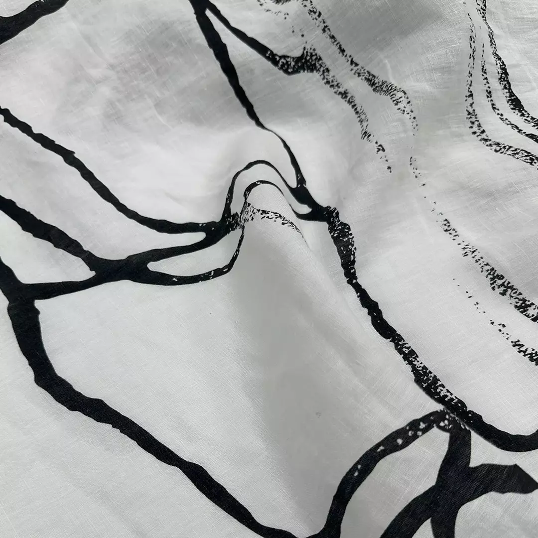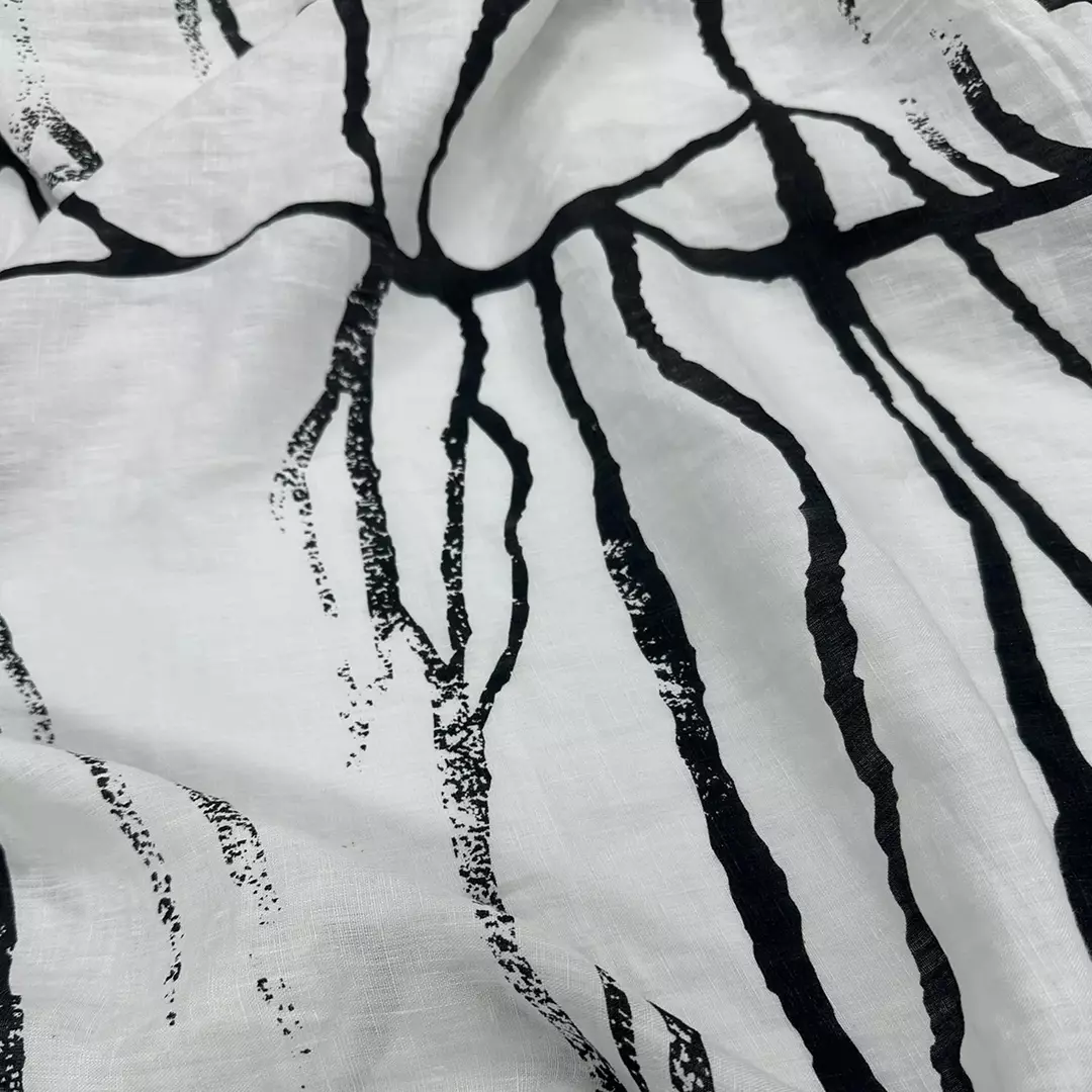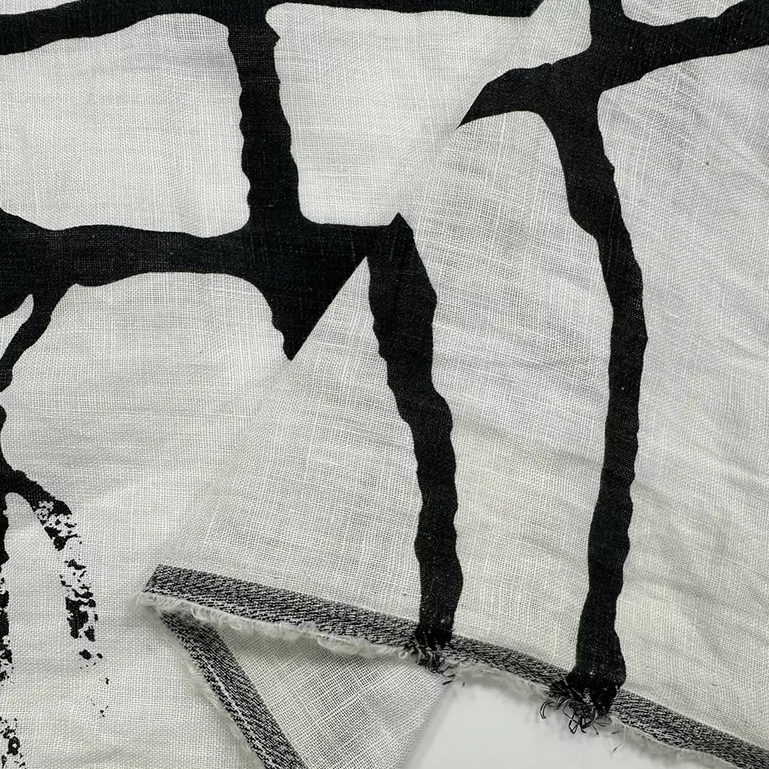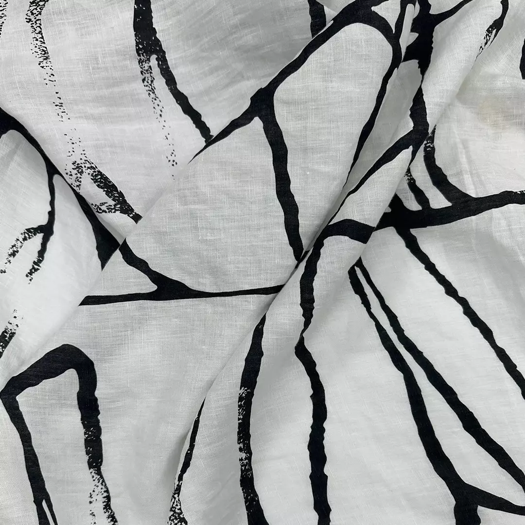 abstract linen printed fabric,This 100% linen washed fabric features a bold abstract black-on-white print, creating a striking modern look while retaining the natural beauty of linen. With a lightweight 160gsm and a width of 140cm, it offers excellent breathability, a soft handfeel, and a relaxed drape.