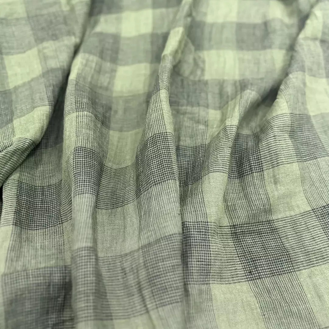 This 100% linen fabric features a classic yarn-dyed check pattern, woven with contrasting dyed yarns for depth and definition. The fabric undergoes a soft washing process to enhance drape, comfort, and breathability, making it ideal for both apparel and home textile projects.