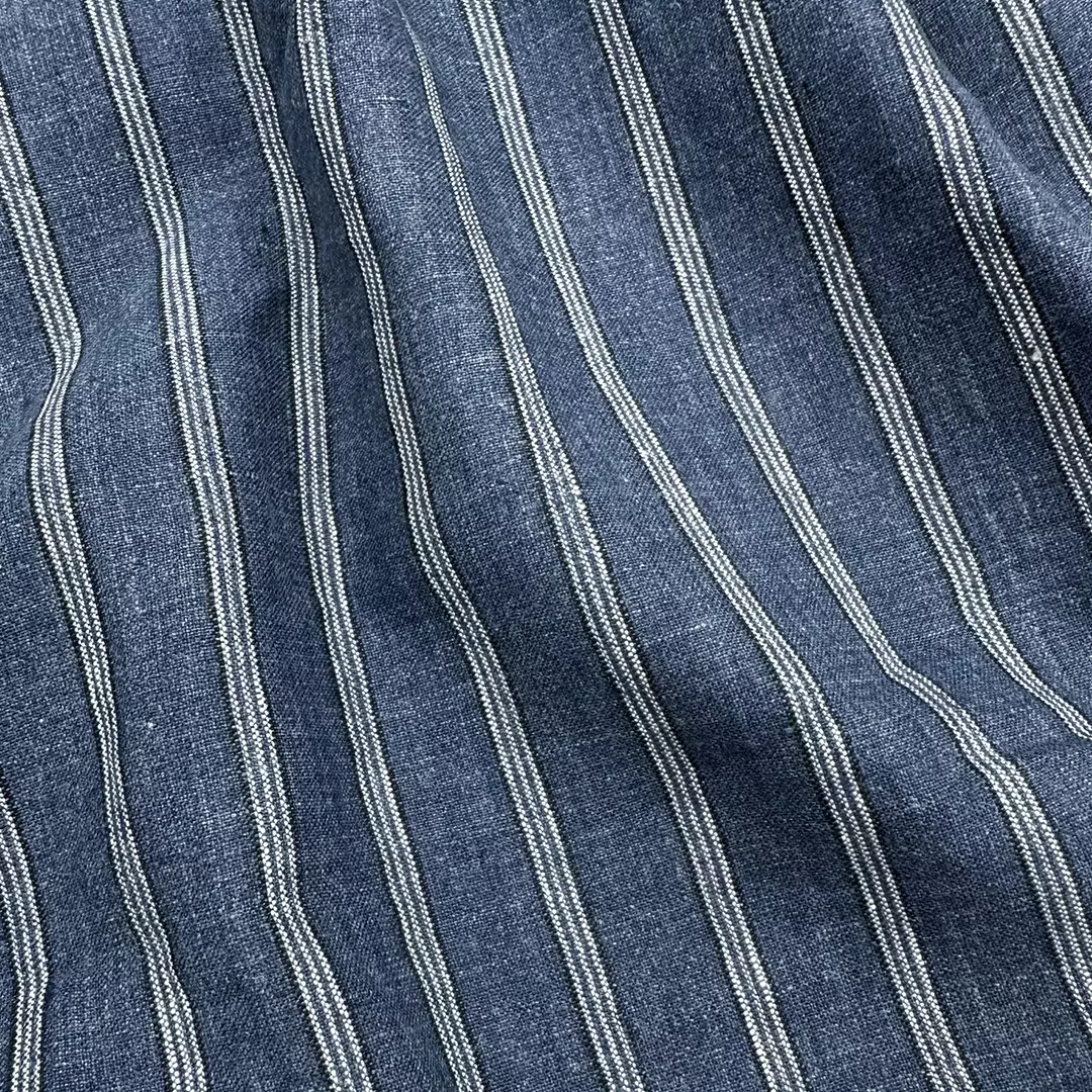 This 100% linen fabric features a sophisticated Delavé yarn-dyed finish with classic diagonal stripes, offering a subtle melange effect and a timeless appeal. At 175gsm and 140cm wide, it is versatile for both apparel and light home textile applications.