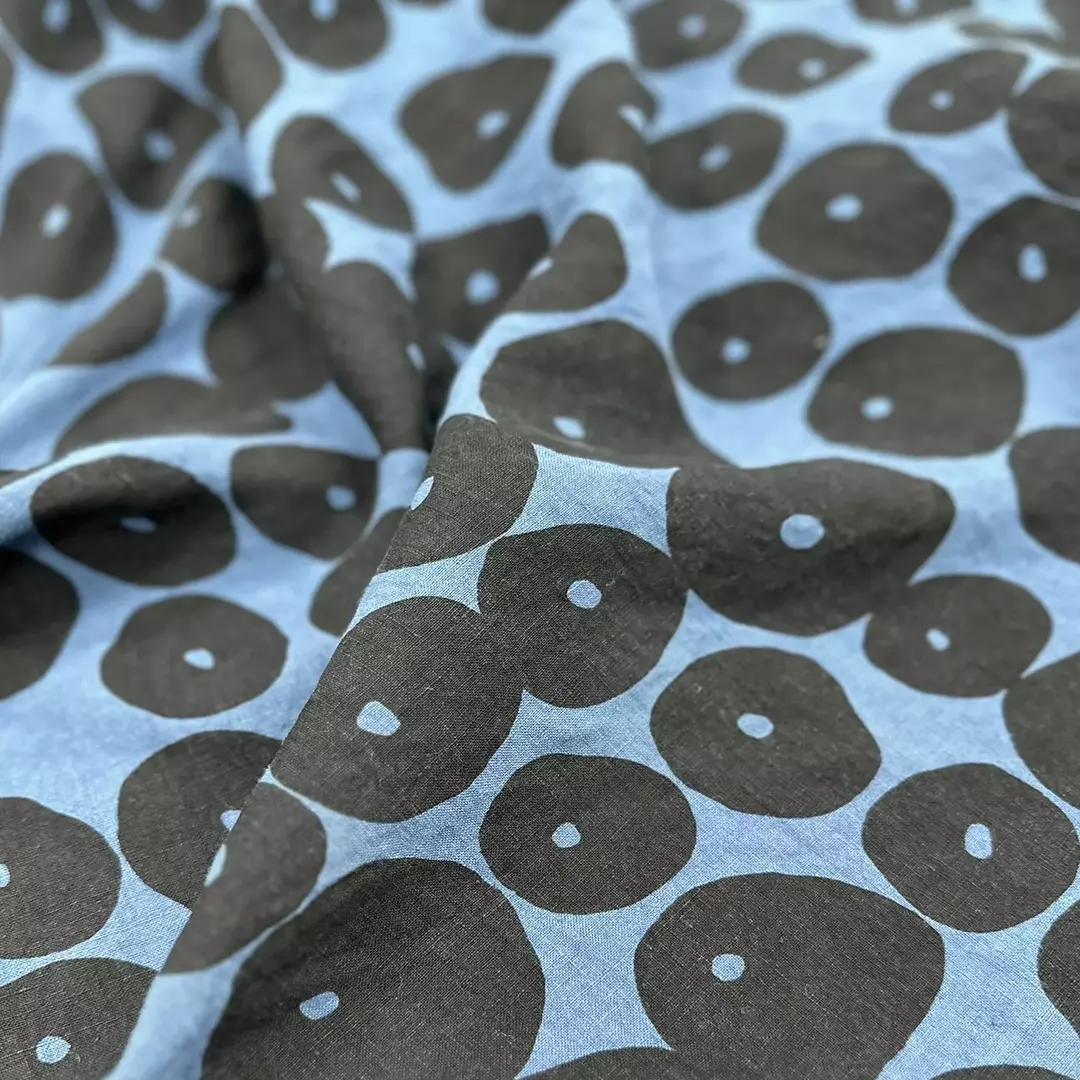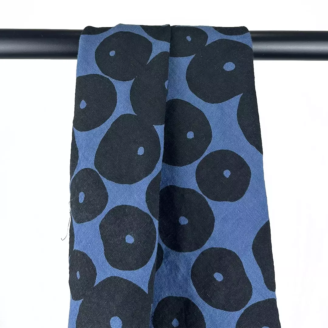 Hand printed linen fabric,Made from 100% premium linen, this fabric showcases a bold, large-circle motif, applied using traditional hand-printing techniques. The sand-washed finish gives it a soft, vintage touch while enhancing comfort and breathability. Weighing 185gsm and measuring 140cm wide, it is ideal for a wide range of apparel and creative textile projects.