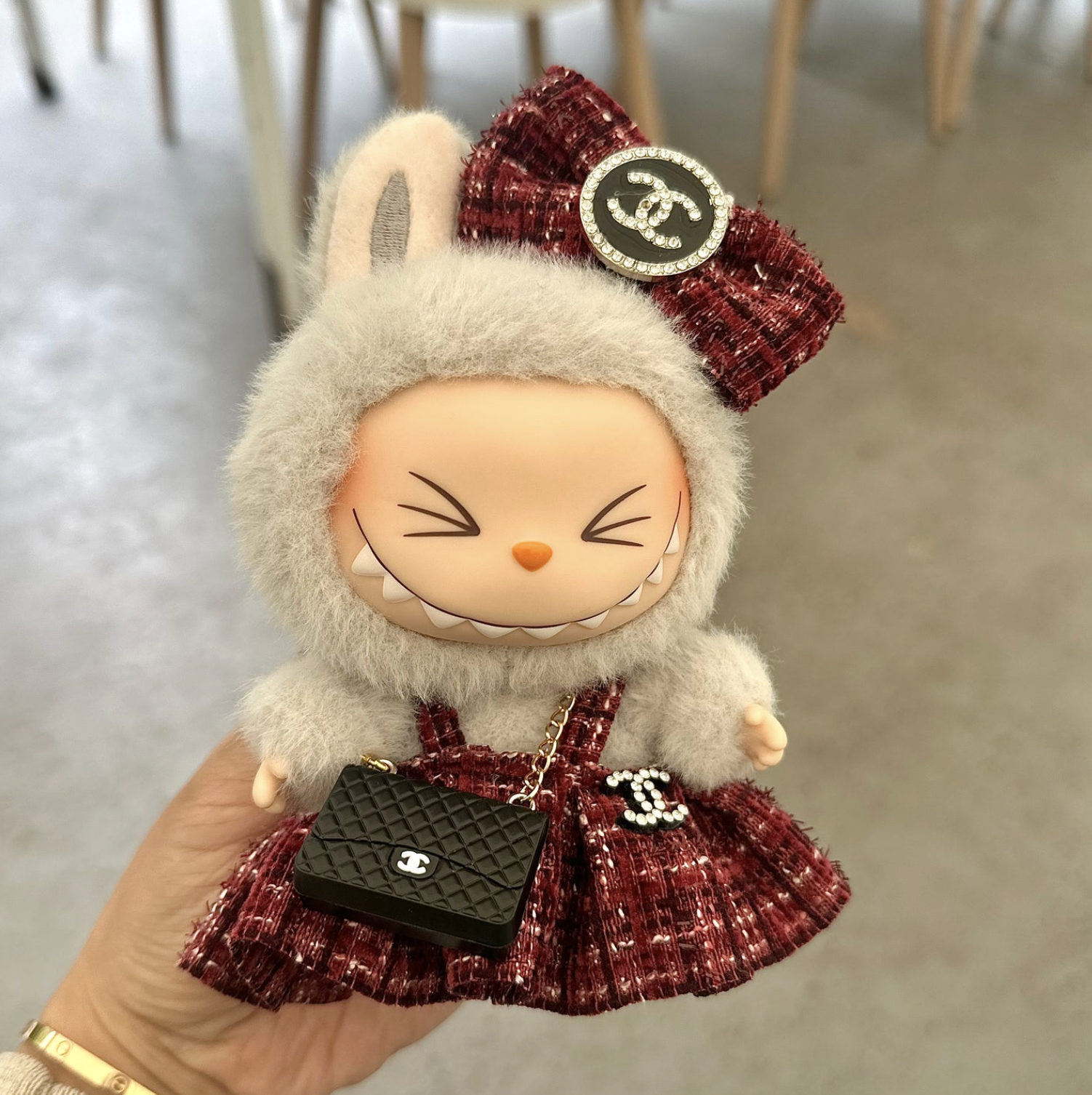Labubu clothes The Monsters Labubu Fashion Dress – Chanel Style Red Skirt+ Bow + Chanel Style Bag
