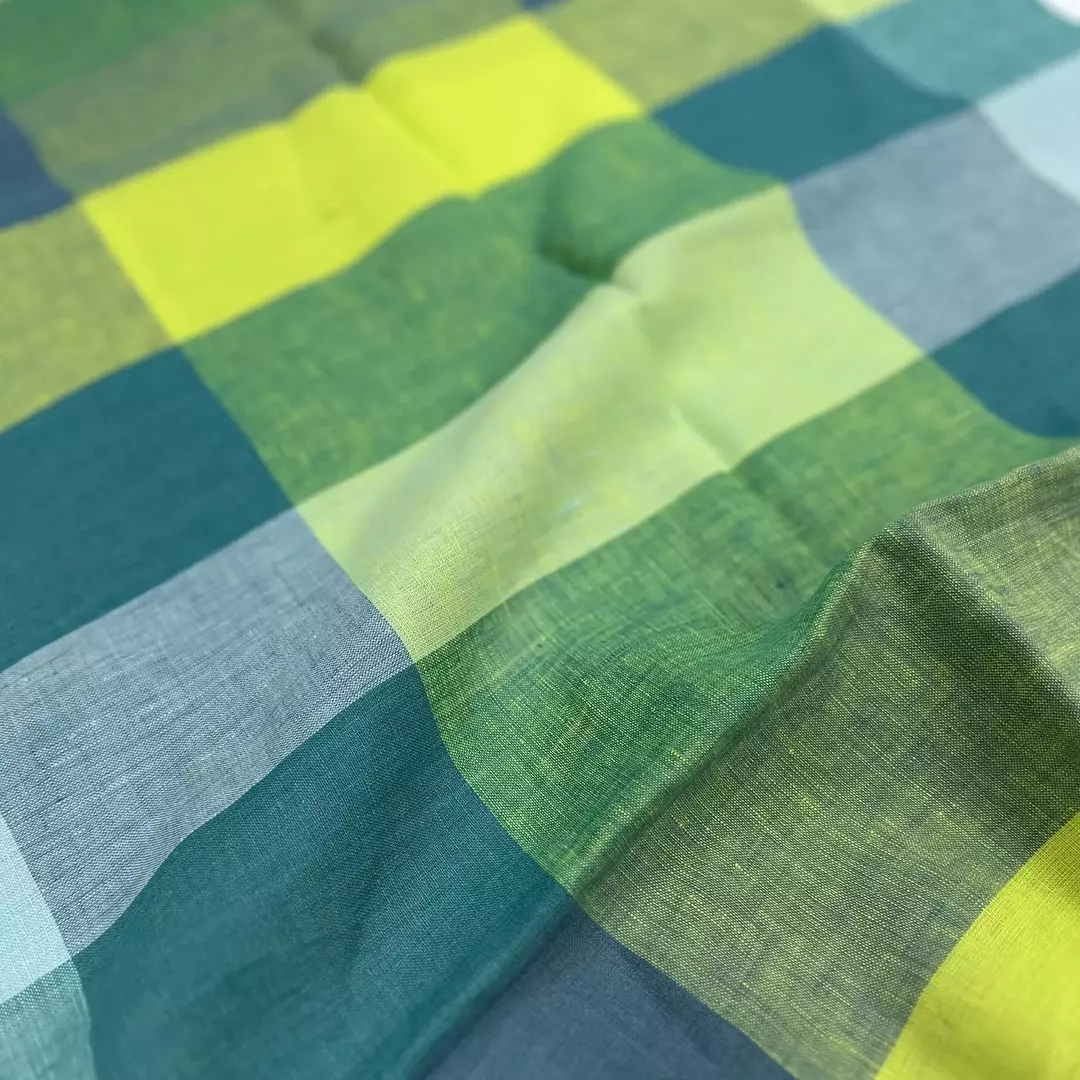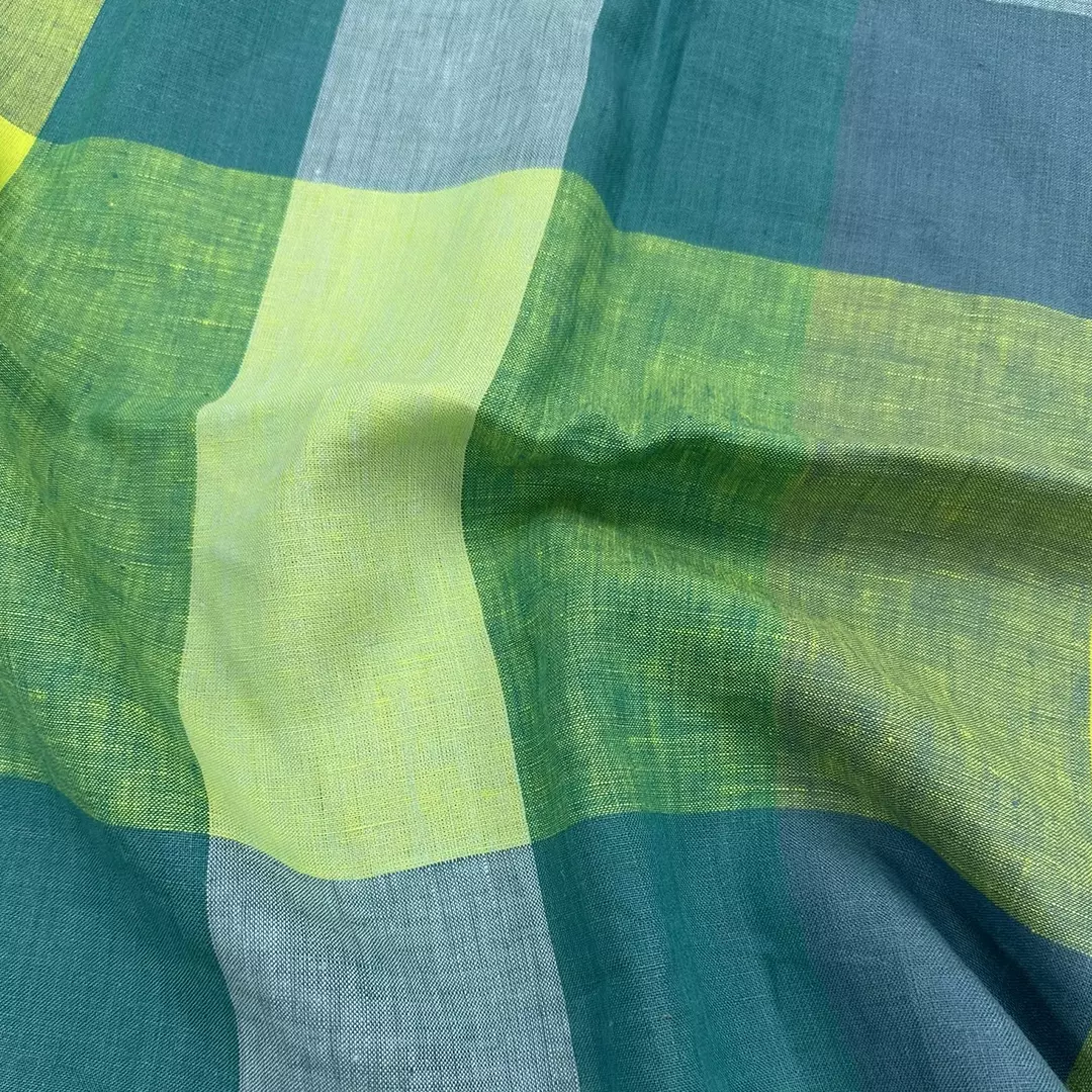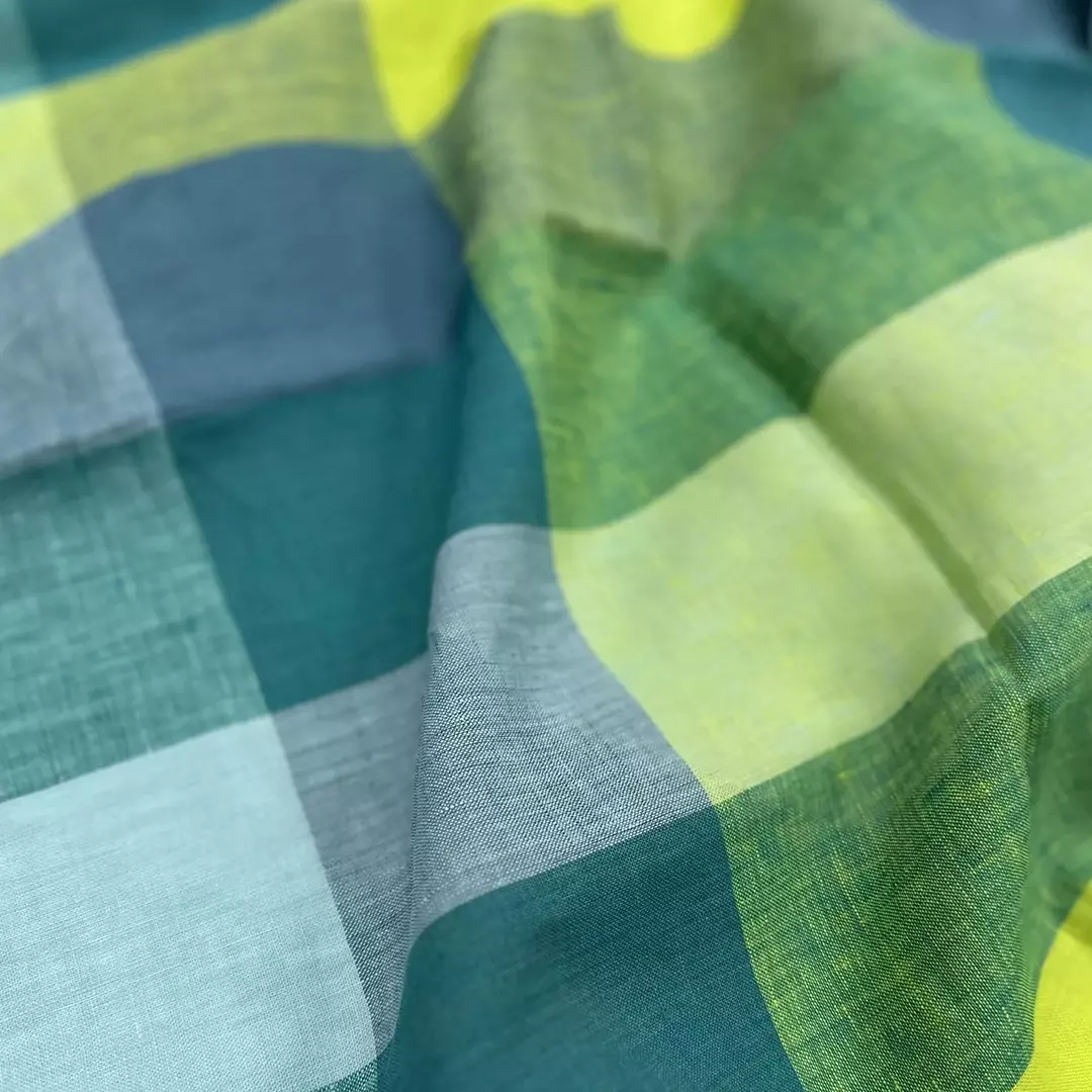 This 100% linen fabric showcases a bold large-check design in fresh shades of green, aqua, and lemon yellow, perfect for a vibrant yet natural look. The yarn-dyed construction ensures long-lasting colors, while the medium weight of 175gsm offers a versatile balance between drape and structure.