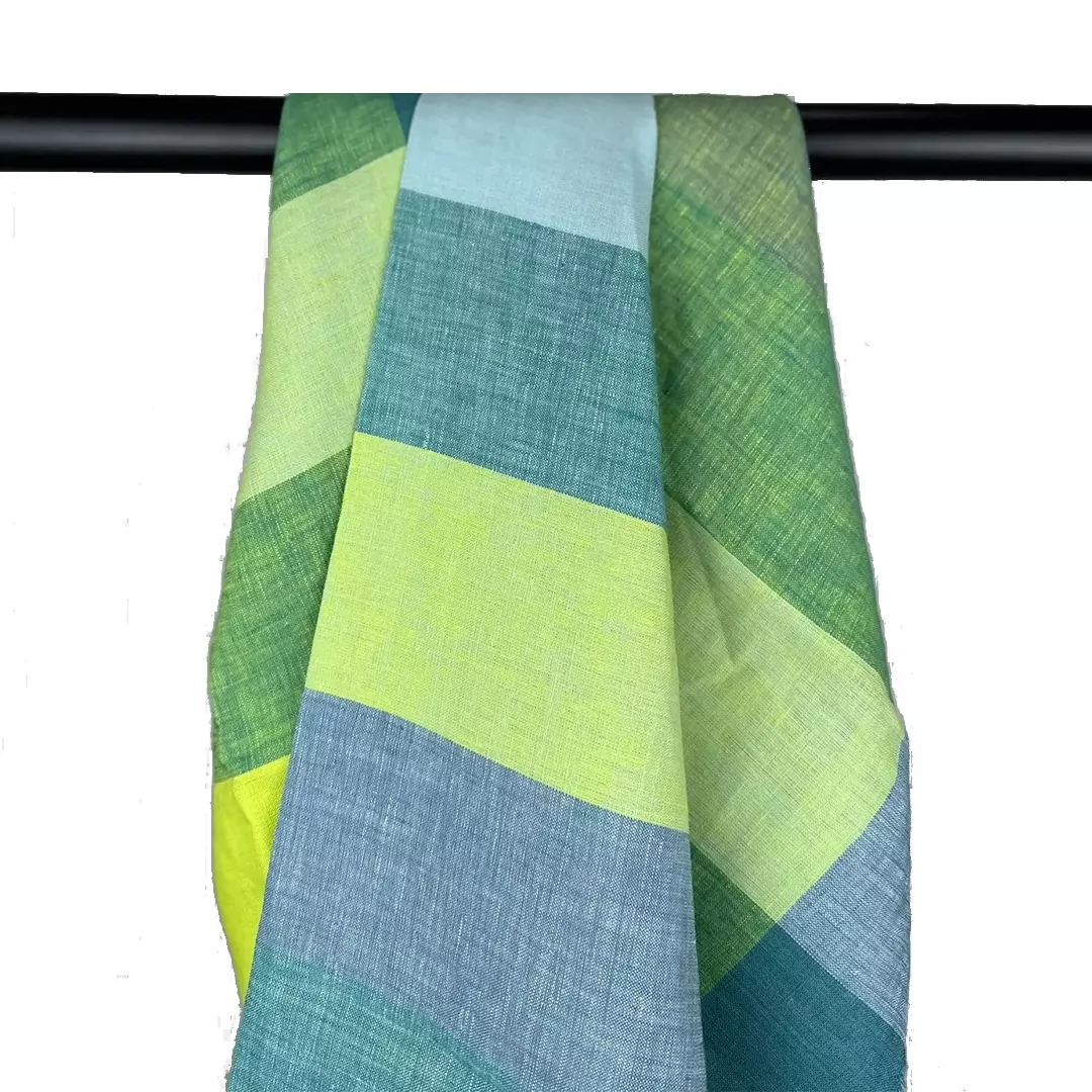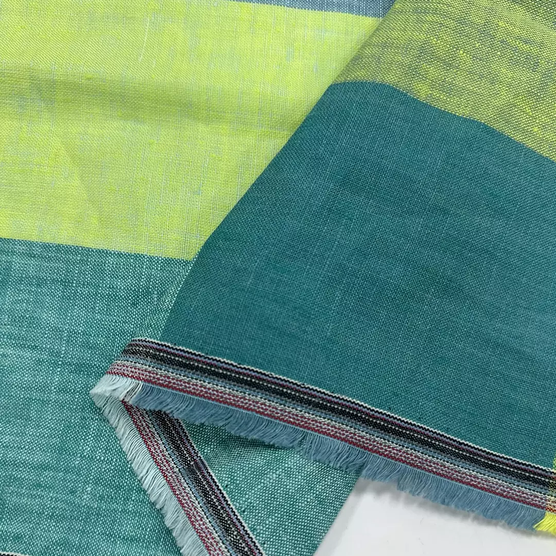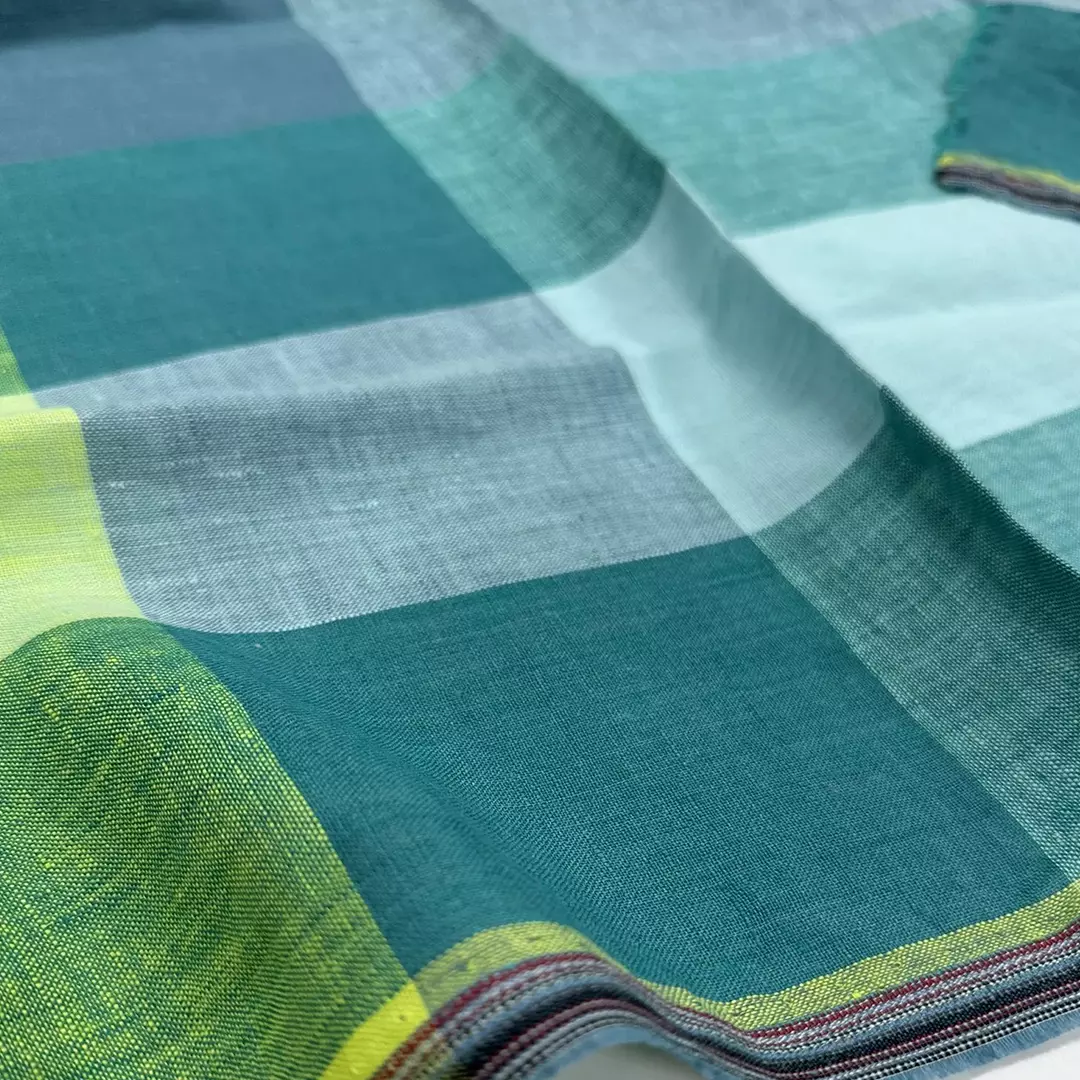 This 100% linen fabric showcases a bold large-check design in fresh shades of green, aqua, and lemon yellow, perfect for a vibrant yet natural look. The yarn-dyed construction ensures long-lasting colors, while the medium weight of 175gsm offers a versatile balance between drape and structure.